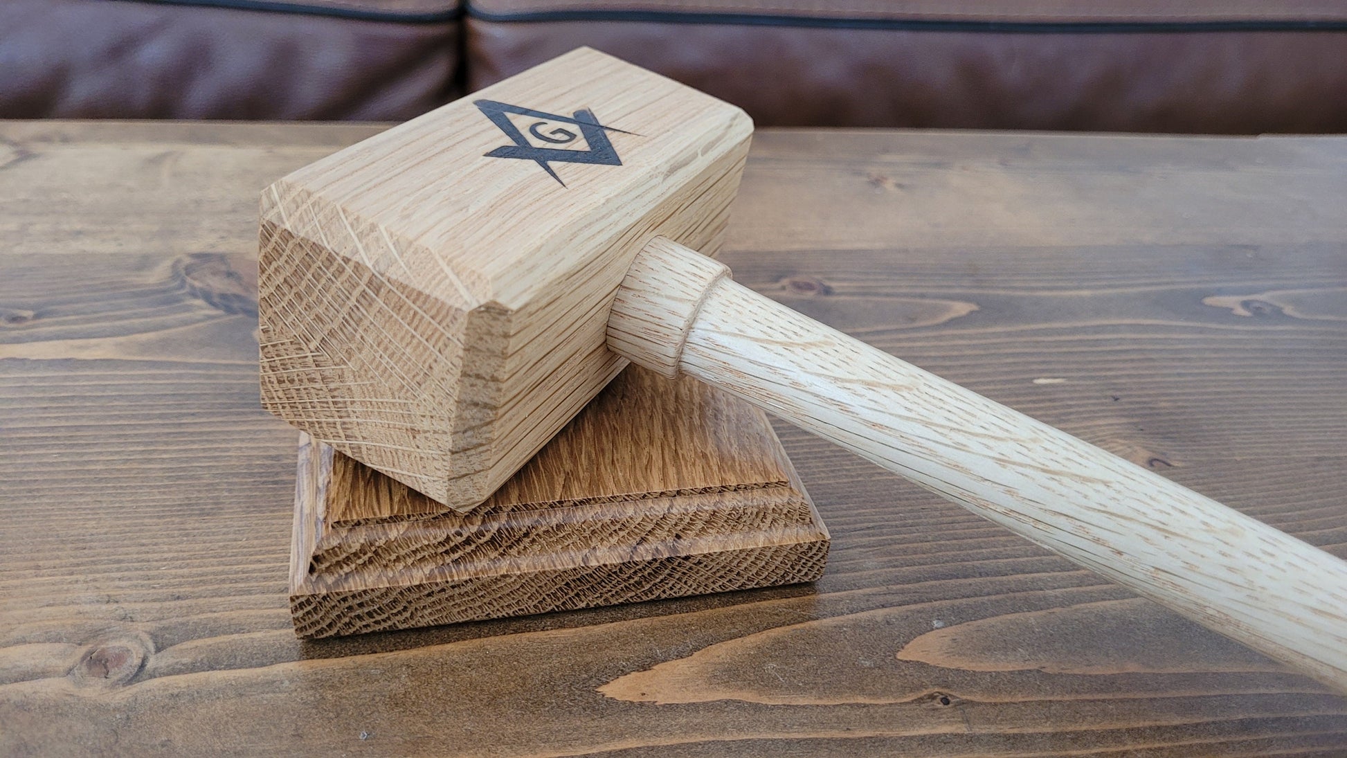 Bring order to the Lodge with style! This beautiful gavel and sounding block is hand made in Canada with solid White Oak. The Masonic Square and Compass artwork was also burned in by hand.