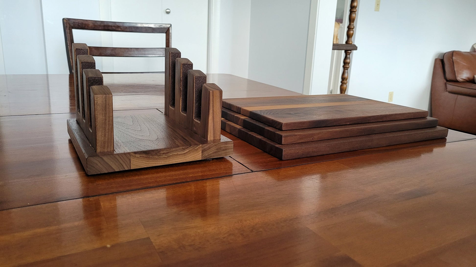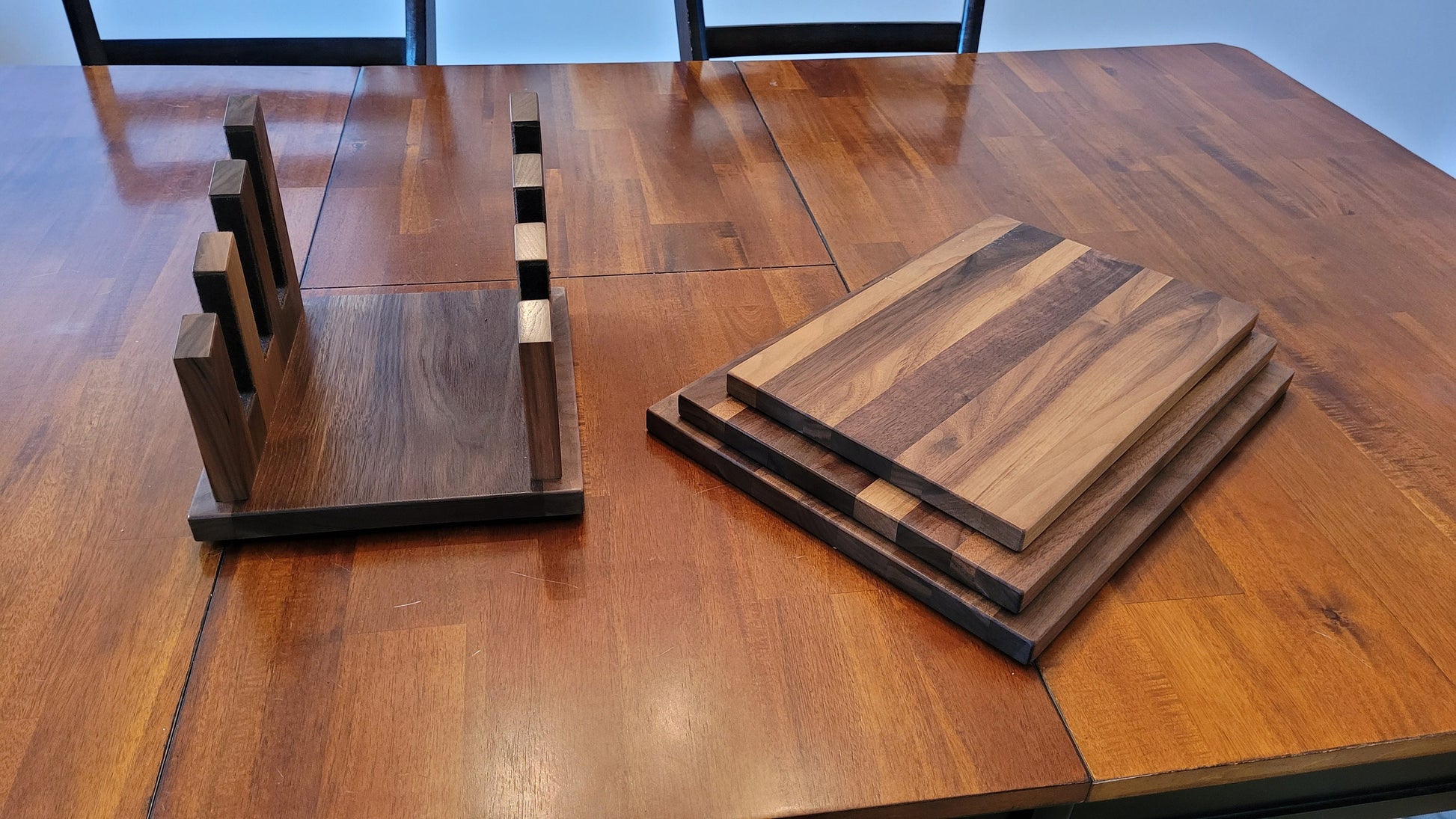 This beautiful cutting board set is made of solid Walnut. The stand is made of walnut, and is also fitted with felt lined supports to provide soft and quiet storage. The set includes 1 small, 1 medium and 1 large cutting board, with a countertop stand.