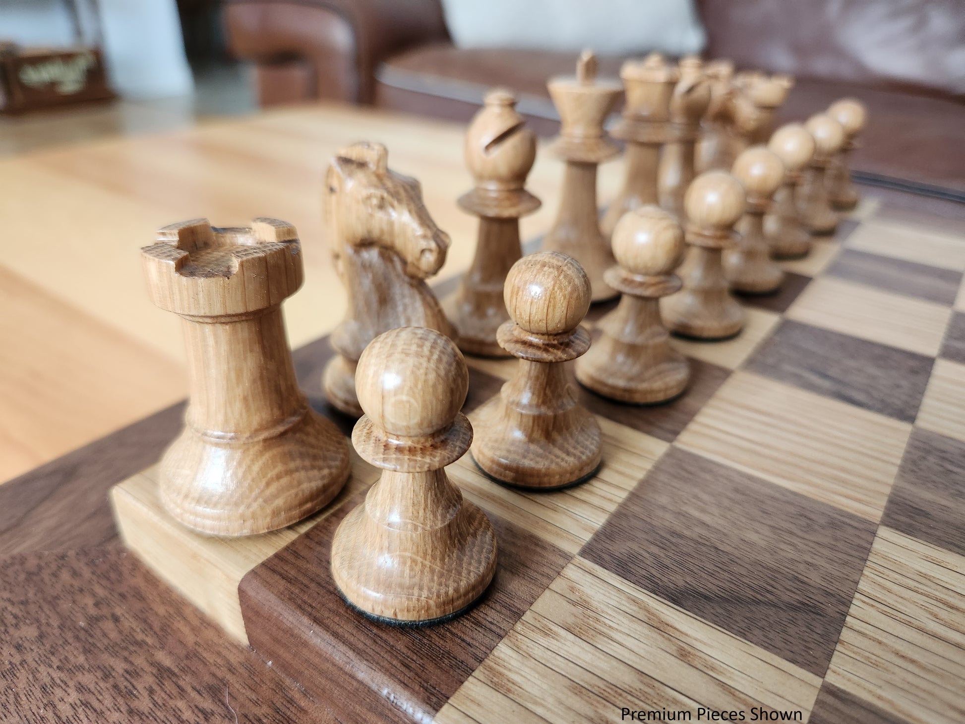 This chess board can also be paired with optional sets of game pieces, both in standard and premium weighted versions. The standard pieces are common boxwood pieces (dark ones stained), and are great for the casual or entry level player who wants a beautiful, natural wood set to play on. The premium weighted pieces are made from matching Walnut and White Oak, with all natural grain (no stain), and are clear coated with lacquer. Premium sets include extra queens (1 per side). Additionally, finely finished matching storage boxes are also an option, which are made from the same wood species as the pieces.