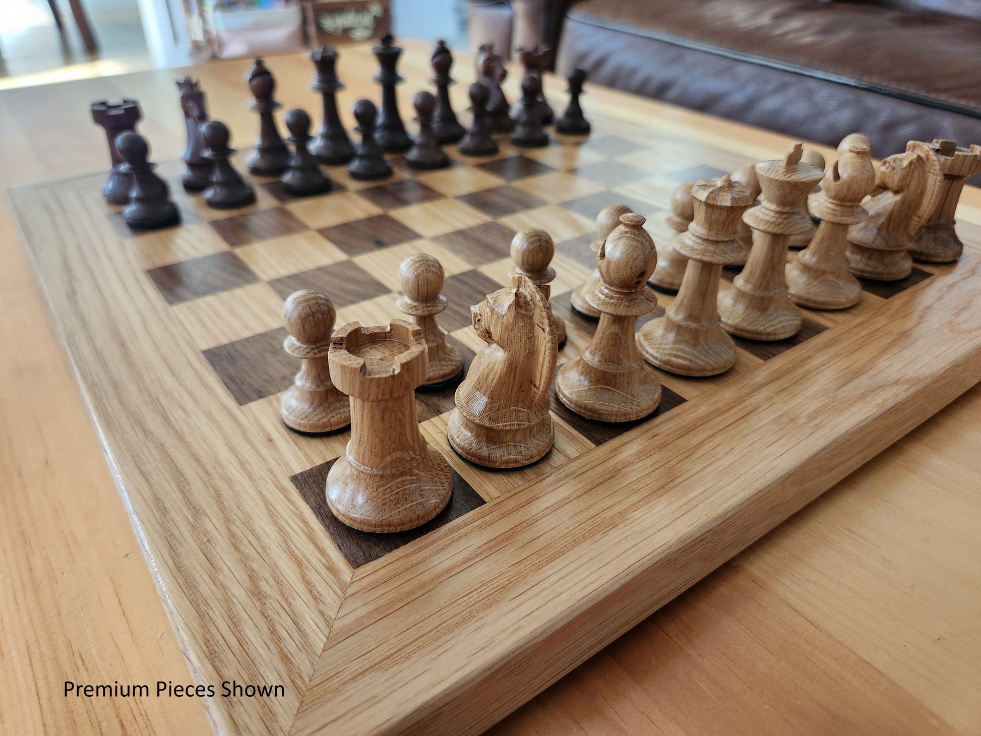 Wood Chess Set - Solid Walnut and Oak Board with Oak Border - Coffee Table Size - Hand Made Board