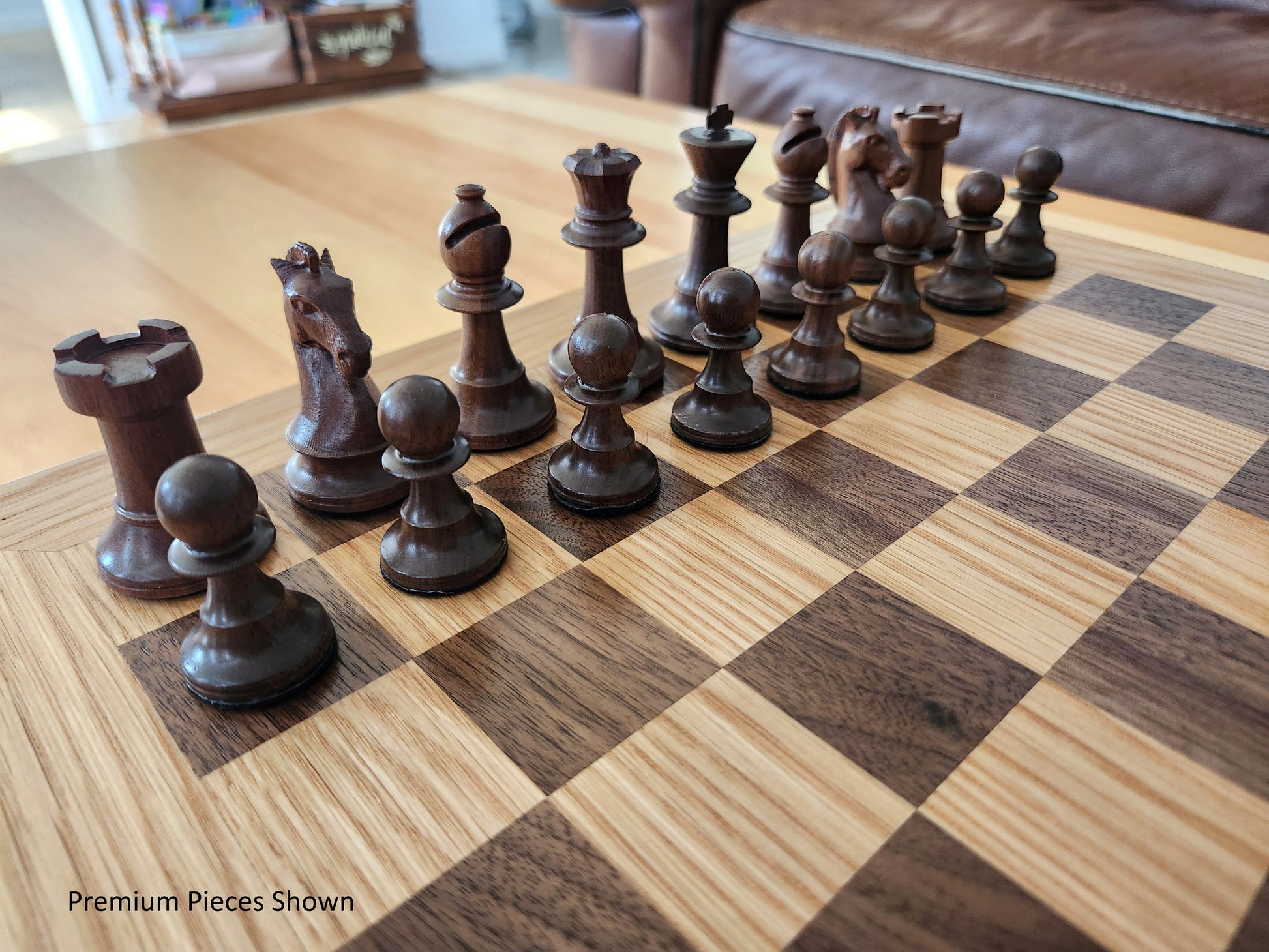 This chess board can also be paired with optional sets of game pieces, both in standard and premium weighted versions. The standard pieces are common boxwood pieces (dark ones stained), and are great for the casual or entry level player who wants a beautiful, natural wood set to play on. The premium weighted pieces are made from matching Walnut and White Oak, with all natural grain (no stain), and are clear coated with lacquer. Premium sets include extra queens (1 per side). Additionally, finely finished matching storage boxes are also an option, which are made from the same wood species as the pieces.